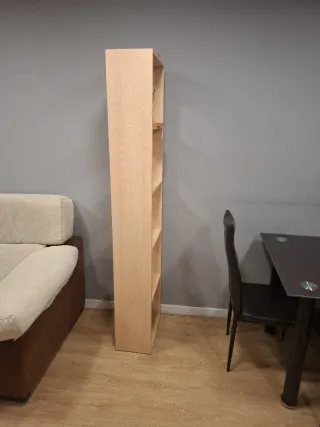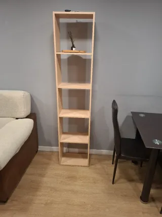 Estantería de diseño moderno con varios niveles para organizar tus objetos. - Estructura de madera clara. - Diseño vertical y estrecho.