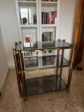 Juego compuesto por dos estanterías, una grande y otra auxiliar, las dos con estructura de madera y metal dorado, y baldas de cristal. - Diseño moderno y elegante. - Baldas de cristal ahumado. - La auxiliar tiene patas con ruedas para fácil movilidad. Se pueden vender por separado. Negociable. Medidas estantería auxiliar: largo 83, ancho 48, alto 82cm. Medidas estantería grande: largo 98, ancho 43, alto 188cm.