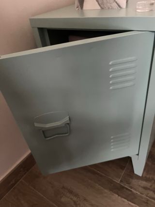 Mueble versátil que puede usarse como mesita de noche y una estantería. Son de sklum y eta en perfecto estado. Lo vendo porque ya no va a juego con mi decoración. Diseño moderno en color verde agua. Y el material es metal Esta poco usado, ha estado en un cuarto de invitados sin usar