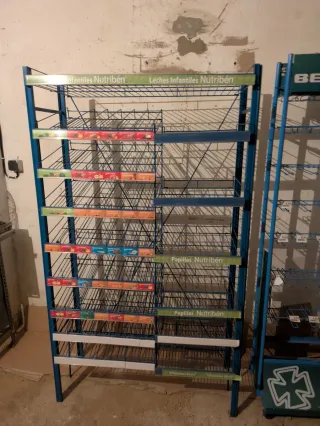 Se venden estanterías metálicas de gran tamaño, ideales para organizar productos. - Altura de 175cm. - Estructura robusta de metal. - Diseño de múltiples niveles para exhibición.