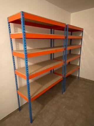Estantería metálica de gran capacidad, ideal para almacenes o garajes. 2 unidades 350€ cada unidad - Medidas: 2,40 metros de alto, 1,90 metros de ancho y 0,60 metros de fondo. - Estructura robusta y duradera. - Bandejas de madera 750kg soporta - Combinación de colores azul y naranja.