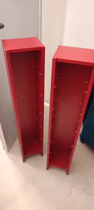 Se venden dos estanterías modelo Billy de Ikea en color rojo. Son perfectas para organizar tus CDs o DVDs. - Capacidad para aproximadamente 180 CDs. - Diseño estrecho y alto.