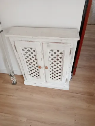 Mueble auxiliar de madera con un diseño encantador y acabado desgastado. - Puertas con diseño de celosía. - Tiradores redondos de madera. - Acabado en blanco y detalles en madera natural.