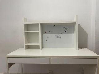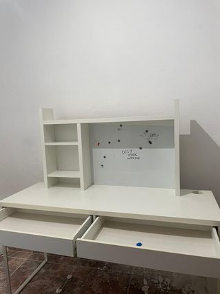 Escritorio funcional con espacio de almacenamiento y superficie para notas. - Dos cajones amplios. - Estantería integrada con baldas. - Pizarrón blanco en la parte superior.