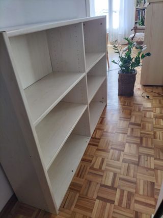 Estantería modular de IKEA, modelo Kallax. Su diseño versátil permite colocarla tanto en vertical como en horizontal. Perfecto estado. - Estructura de madera con acabado en color marrón. - Ocho cubos de almacenamiento. - Ideal para organizar libros, objetos decorativos o ropa. - Medidas: alto 146,5cm, ancho 76,5cm y fondo 39cm. - Peso máximo por balda: 13kg.