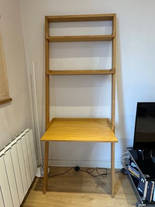 Estantería de madera con escritorio integrado. Un mueble funcional y elegante para tu hogar. Estilo escandinavo. - Diseño de estantería escalonada. - Superficie de escritorio amplia. - Acabado en tonos naturales de madera.