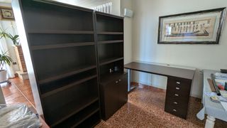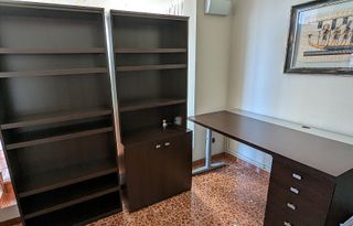 Conjunto de muebles para despacho de color Wengue. La estanteria mide 181,5cm de alto x 80,5cm de ancho x 28cm de profunda. El escritorio mide 140cm de ancho x 60cm con el añadido de aluminio 80cm. La libreria con puertas mide 181,5cm x 75,5cm y 30cm de profundo en la parte de las estanterias y 40 en la parte que tiene puertas. En el panel trasero tiene un pequeño agujero para pasar cables. - Escritorio con patas metálicas y cajonera. - Dos estanterías a juego, una con módulo de puertas.