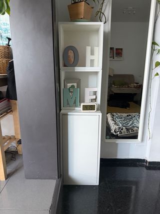 Conjunto de estantería modular y espejo de pared. - Estantería blanca con cubos. - Espejo con marco.