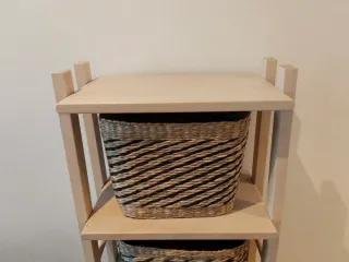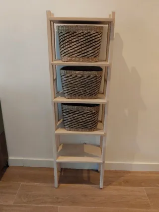 Estantería de madera con un diseño moderno y funcional, perfecta para organizar tu baño o cualquier estancia. - Estructura de madera. - Incluye dos cestas de mimbre. - Diseño de baldas abiertas.