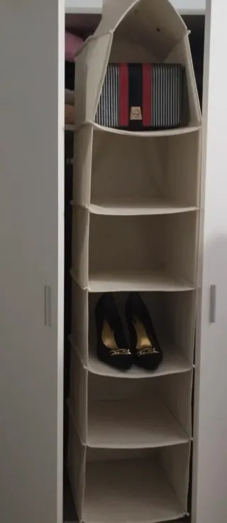 Organizador de tela para colgar en armarios o estanterías con 6 compartimentos.