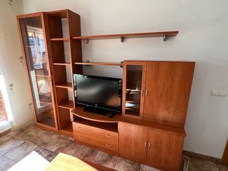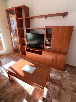 Conjunto de muebles de salón en buen estado. - Mueble bajo con puertas y cajones. - Vitrina alta con puertas de cristal. - Estantería. - Mesa de centro.