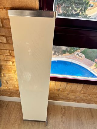 Estantería de madera clara de 4 estantes. De estar de pie el tacón de la madera se ha despegado o le falta un poquito como se puede apreciar en las fotos. Es nueva a estrenar pero esta un poco desgastada de estar de pie mucho tiempo sin haberse usado. Las medidas aproximadas son: 85cm ancho 30cm fondo 190cm alto