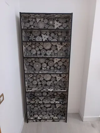 Estanteria de melamina, estilo industrial. Medidas: Ancho 70 cm Alto: 121 cm Profunfidad: 21,5 cm La compré y por las medidas no me quedaba bien, por lo que no ha llegado a usarse. Tiene los agujeros para el montaje ya hechos. *Sólo venta en persona
