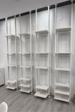 Estanterías expositoras para tienda – vestidor hogar (modelo ELVARLI de ikea) Vendo conjunto de estanterías expositoras profesionales en color blanco, ideales para tienda de ropa, boutique o showroom y vestidores en hogares ✔ Estructura metálica resistente ✔ Estantes regulables en altura ✔ Diseño moderno y minimalista ✔ Perfectas para colgar ropa y exponer productos ✔ Muy buen estado 📏 Fácil montaje y configuración modular. 📍 Recogida en tienda