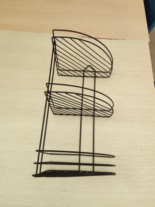 Estante de esquina de hierro con un diseño de alambre abierto. - Estructura de tres niveles. - Ideal para organizar espacios pequeños.