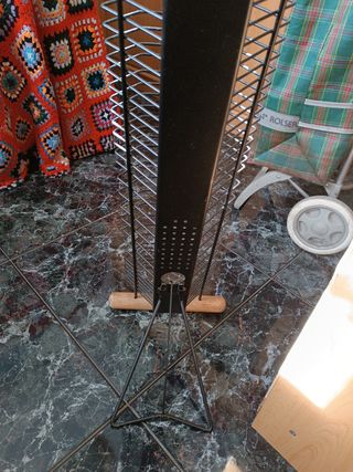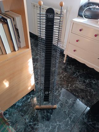 Elegante estantería para guardar tus CD's y Vídeos. Es de metal, color negro, y tiene capacidad para 60 CDs y 5 videos VHS. - Diseño con figura de saxofonista. - Perfecta para organizar tu colección de música y películas. - Se encuentra en buen estado.