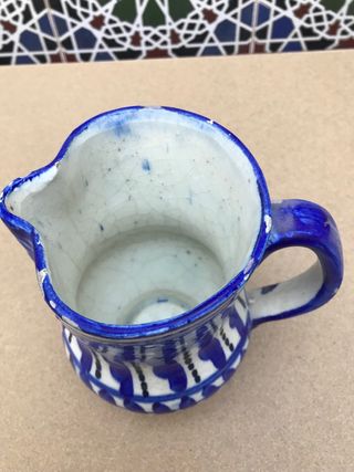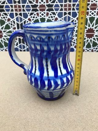 Precioso jarrón de cerámica, ideal para decoración. Es de color azul y blanco, con un diseño atractivo. - Tiene un tamaño mediano, perfecto para mesas o estanterías. - Presenta un estilo rústico y artesanal. - Conserva detalles de craquelado en la superficie.