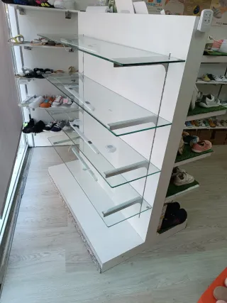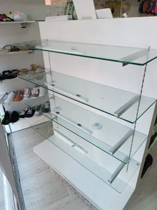 Mueble expositor con varias baldas de cristal. - Estructura principal en blanco. - Baldas de cristal. - Soportes metálicos para las baldas. - Base de madera. Altura regulable Con 4 baldas de cristal de recambio