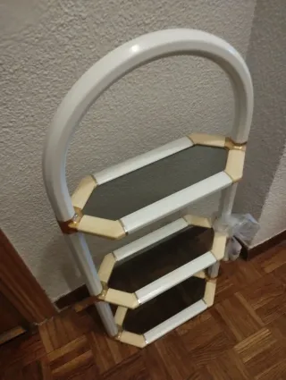 Estantería escalonada con un diseño moderno y funcional. - Combinación de madera y acabado blanco. - Estructura tipo escalera.