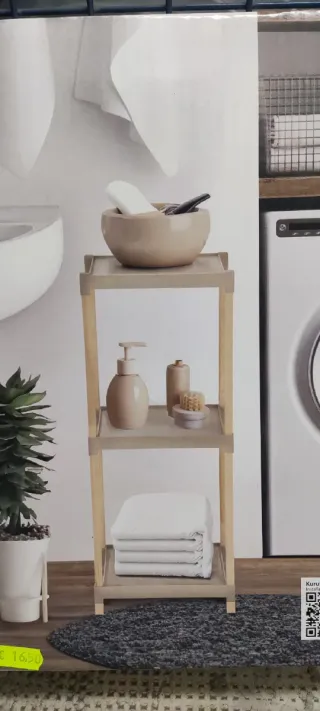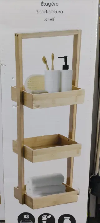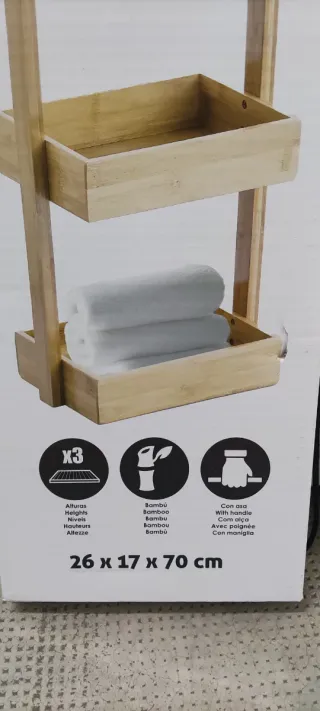 Estantería de tres niveles con un diseño moderno y funcional. - Fabricada en bambú y madera. - Color natural de la madera y blanco en los recipientes. - Ideal para organizar artículos de baño o tocador.