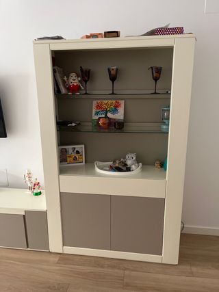 Conjunto de muebles de salón en buen estado, ideal para organizar tu espacio. - Mueble bajo con cajones y compartimentos. - Mueble alto con puertas y hueco. - Vitrina alta con puerta de cristal. - Estantería superior.