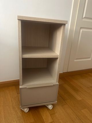 Estantería auxiliar de madera con un diseño moderno y funcional. Cuenta con dos estantes abiertos y un cajón en la parte inferior. - Estructura de madera. - Cajón frontal. - Ruedas para fácil movilidad.