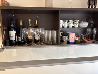 Mueble bar y estantería con un diseño moderno y funcional. Combina la calidez de la madera con la transparencia del cristal. - Estructura principal de madera. - Puertas de cristal para exhibir tus objetos. - Estantes interiores para almacenamiento. - estanteria (120x43x3) cm
