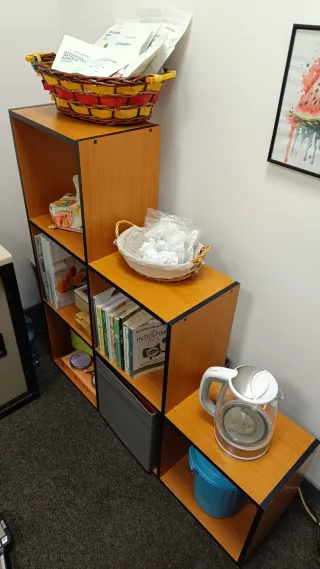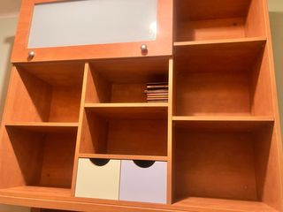 Estantería de madera con un diseño moderno y funcional. - Dos cajones de diferentes colores. - Compartimentos abiertos para almacenamiento.