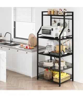 Estantería de cocina con un diseño moderno y funcional. Ideal para organizar tus utensilios y electrodomésticos. - Estructura principal en metal negro. - Superficies de madera color negra. - Múltiples niveles de almacenamiento. - Incluye ganchos laterales para colgar.