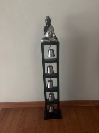 Elegante estantería de estilo tailandés con una figura de Buda y cinco campanas colgantes. - Diseño vertical y estilizado. - Figura de Buda detallada. - Cinco campanas metálicas. - Base estable.