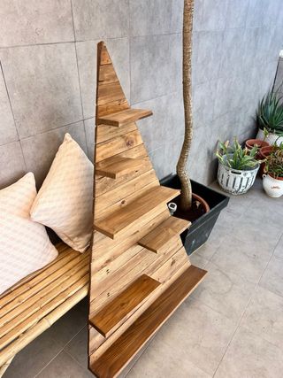 estanteria en forma de arbok de madera. ancho 79 la parte de abajo que es la mas ancha, profundo 13 y alto 138 contanto el tronco que son 15 y tiene 6 estantes