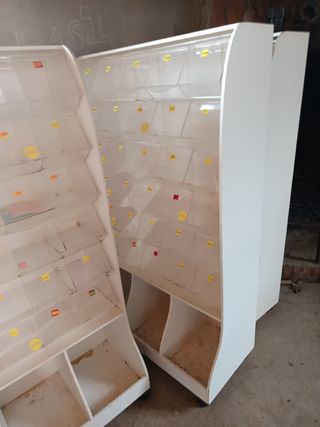 Muebles de tienda , ideales para organizar y mostrar productos. Son de color blanco y están hechos de madera, acrílico y plástico. - Tienen varias divisiones transparentes. - Se encuentran en buen estado, Perfectos para cualquier negocio. Los 4 muebles :1000€ Individuales :270€