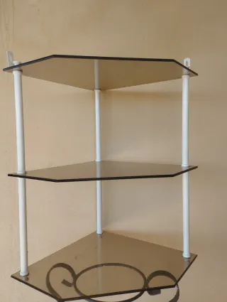 Estantería de esquina con un diseño moderno y funcional. - Estructura de metal - Estantes de cristal - Ideal para aprovechar espacios.