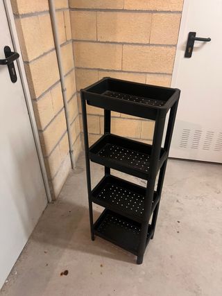 Práctica estantería de plástico con diseño plegable. - Color negro. - Material de plástico resistente. - Estructura de cuatro niveles.
