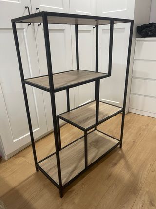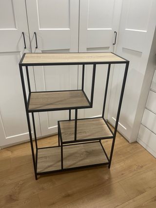 Estantería moderna con un diseño escalonado. - Estructura de metal negro. - Estantes de madera con acabado natural. - Es muy bonita y práctica para coloración de adornos y libros. - Tiene un ligero desgaste en la pata trasera por la zona baja. (3ª foto). - Una pata es regulable mediante tornillo de rosca para ajustar la estantería a suelos desnivelados para que se quede estable y no baile.
