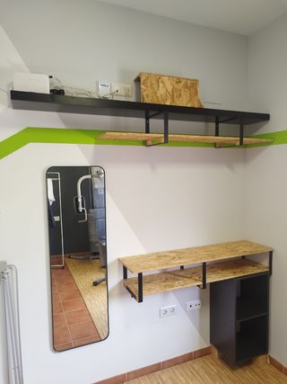 Estantería casera de estilo industrial, con un diseño personalizable y versátil con herrajes del LEROY MERLIN. MEDIDAS *Mueble 1.90 m largo x 27 cm alto x 31 cm fondo *Mueble bajo 1.25 m largo x 23 ancho x 32 de fondo *Mueble oscuro 2 huecos 71 alto x 36 ancho x 32 fondo -Espejo IKEA medidas 1.30 m alto x 40 cm ancho x 2.5 cm fondo. -Cestos plegables negros a juego del LEROY MERLIN.