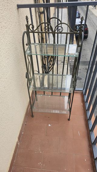 Elegante estantería con estructura de forja y baldas de cristal. Viene con tres de los cuatro cristales que venía pero uno se rompió y tampoco lo necesitaba - Diseño de tres niveles. - Acabado en negro. - Cristal transparente.