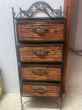 Elegante estantería con un diseño único. - Estructura metálica con detalles ornamentales. - Cajones frontales de bambú. - Tiradores dorados con diseño. - Múltiples niveles de almacenamiento.