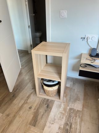 Mueble de dos huecos con un diseño moderno y funcional. Ideal para organizar tus pertenencias. - Estructura de madera clara. - Dos compartimentos abiertos.