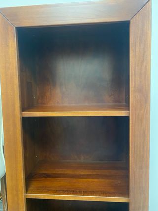 Mueble vitrina con puertas de cristal y estructura de madera. El único desperfecto es el papel superior que está un poco despegado, el resto está impecable