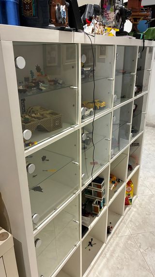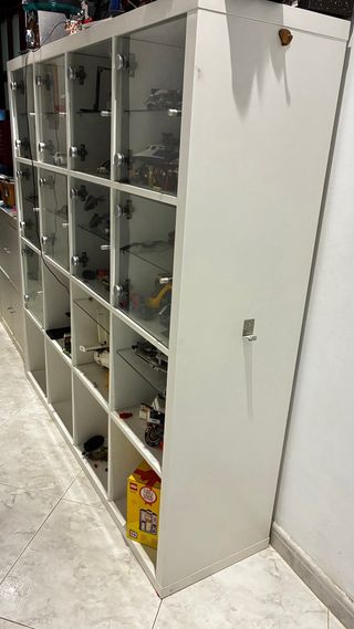 Estantería Kallax de Ikea en color blanco, ideal para organizar tus objetos. - Puertas de cristal para exhibir tus colecciones. - Diseño modular y versátil. Incluye 9 puertas de cristal y uno de los cubículos con doble balda de cristal. Urge