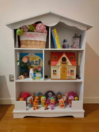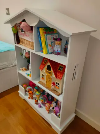 Estantería infantil con diseño de casita, ideal para organizar juguetes y libros. - Estructura de madera blanca. - Diseño de casa con tejado. - Múltiples compartimentos para almacenamiento. Tiene dos marcas de uso, que se ven en las fotos 3 y 4.
