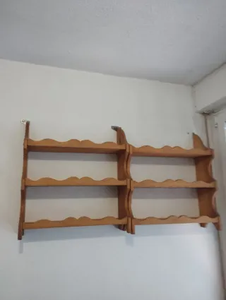 Conjunto de dos estanterías de madera con un diseño rústico. - Acabado en madera natural. - Diseño con borde ondulado. - Hechas a mano