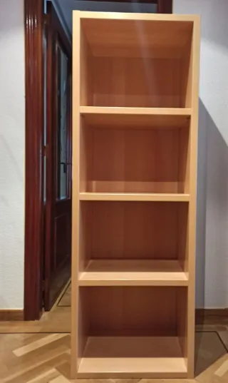 Estantería alta y muy capaz, ideal para aprovechar el espacio. Su diseño moderno se adapta a cualquier habitación. Puede fijarse a la pared para mayor estabilidad. Nosotros la teníamos con cajas de mimbre en cada estante para aprovechar al máximo y con flexibilidad el espacio. - Altura: 1m 59,2 cm - Ancho: 42,2 cm - Profundo: 30,1cm El espacio entre las baldas o estantes es de 35,6 cm - Fabricada en MDF melamínico. Buena calidad, material pesado (comprobar).