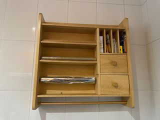 Práctica estantería de madera para organizar rollos de cocina y otros utensilios. - Compartimentos para rollos de papel. - Cajones con tirador. - Barra inferior para colgar. - Diseño funcional para la cocina.