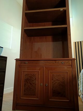 Mueble con cajón y puertas en la parte de abajo y estantería abierta arriba. De madera noble Hecho a medida por artesano Lleva marquetería