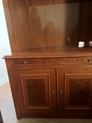 Mueble de madera de estilo clásico, perfecto para salones amplios. Combina estanterías, vitrinas y cajones. - Acabado en madera de cedro. - Diseño con molduras y detalles tallados. - Incluye espacio para televisión y almacenamiento. - Vitrinas con puertas de cristal. Retirada del mueble a cargo del comprador.