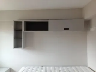 Conjunto de estanterías modulares para habitación juvenil. - Estantería vertical con tres baldas. - Estantería horizontal con dos baldas. - Diseño moderno y funcional.