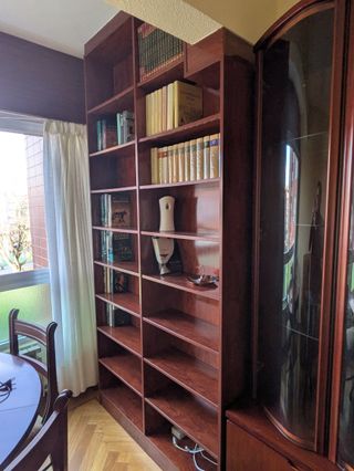 mpresionante mueble de salón compuesto por librería abierta y vitrina lateral de cristal curvo. Madera de gran calidad con acabado brillo. Ideal para bibliotecas o salones grandes. Importante: Desmontaje y transporte a cargo del comprador.