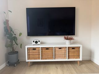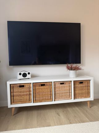 Mueble de almacenaje KALLAX con cuatro espacios. - Diseño moderno y funcional. - Ideal para organizar libros, juguetes o accesorios. - Patas de madera cónicas. Usado de mueble TV provisional. Vendo todo junto. No hago envíos. Medidas en las fotos. Cualquier duda, pregunta.